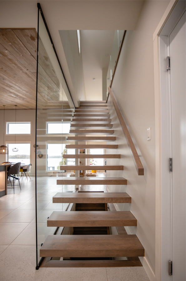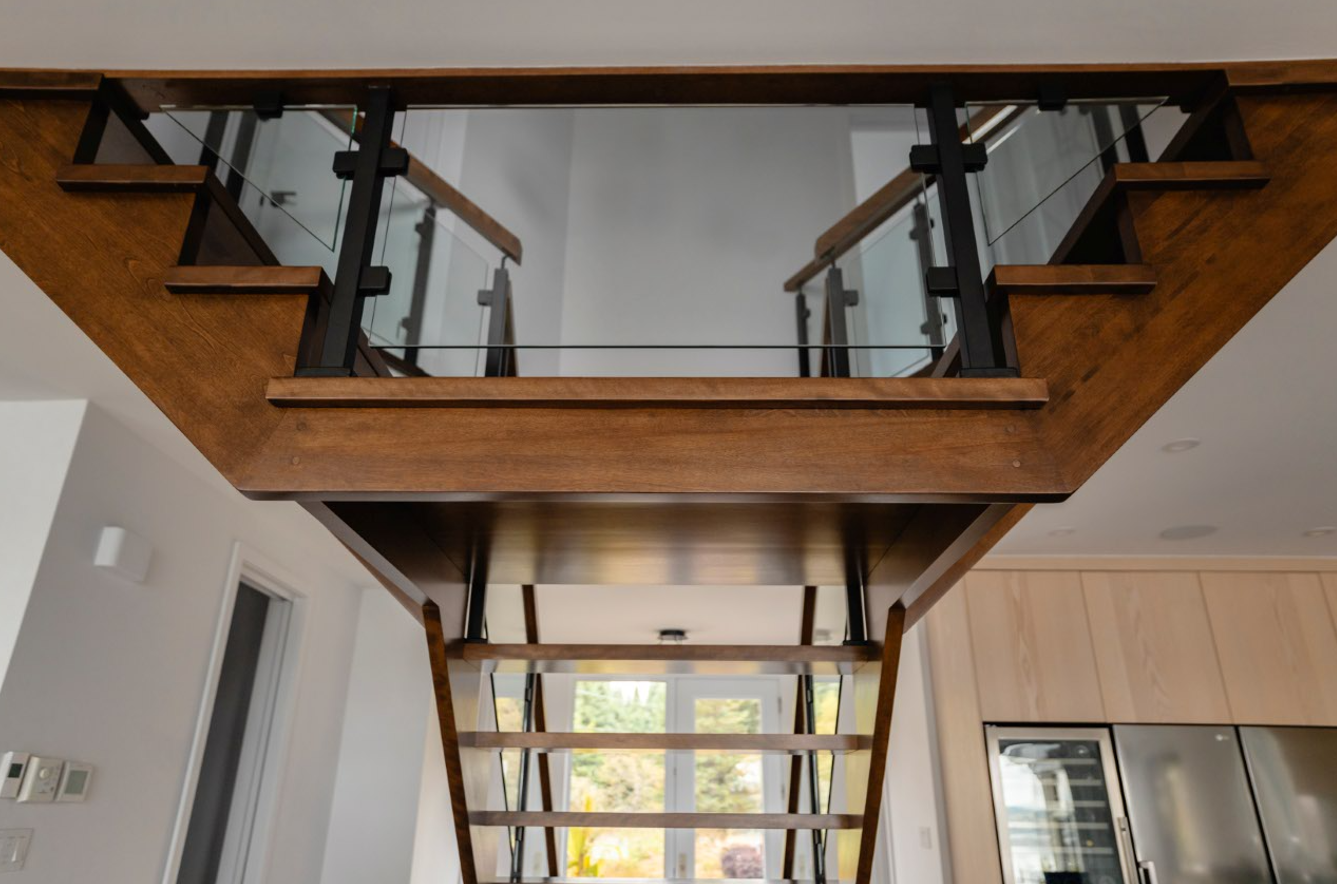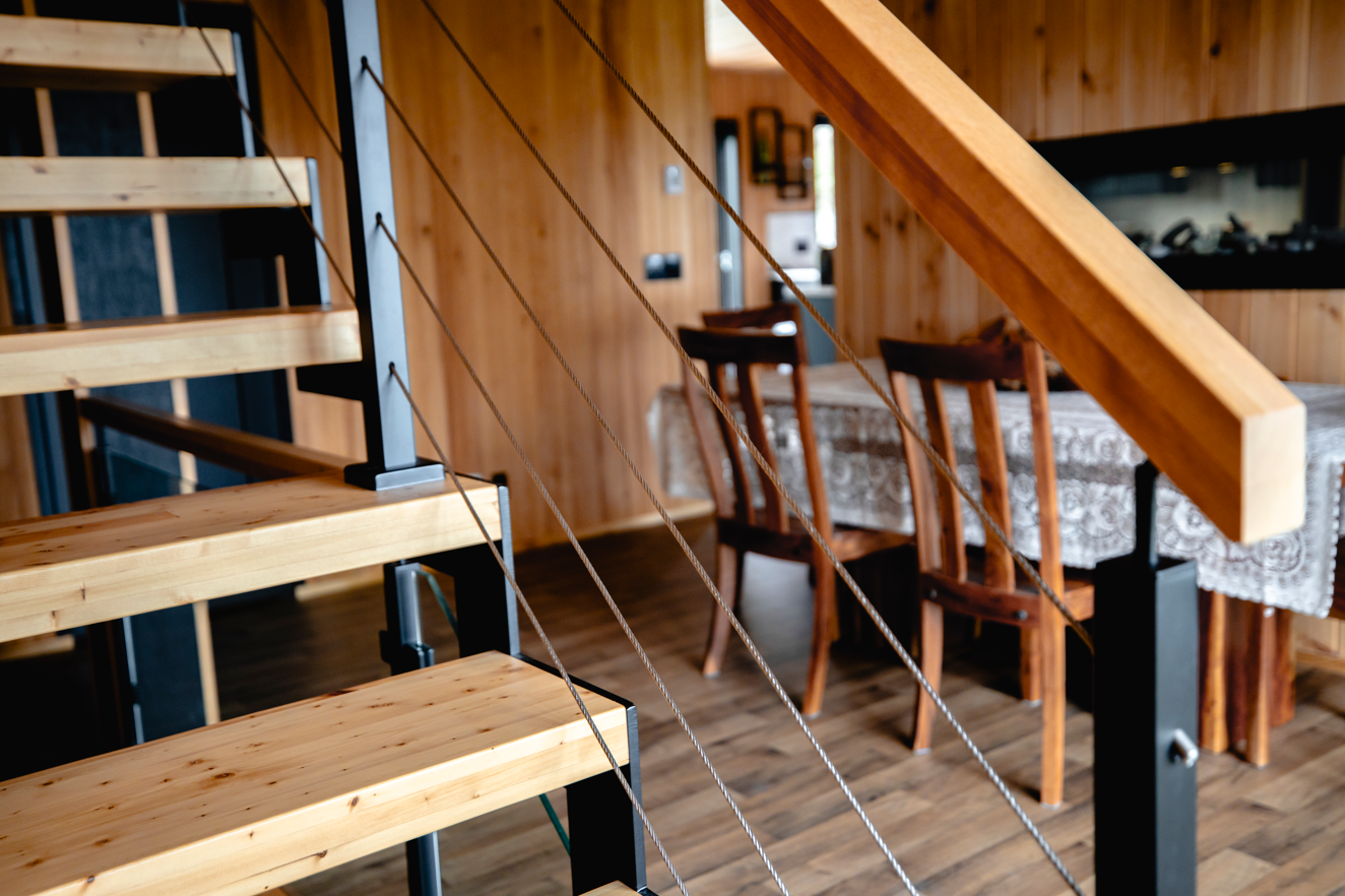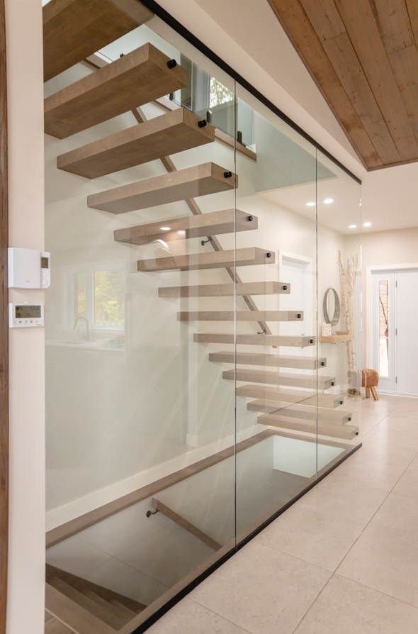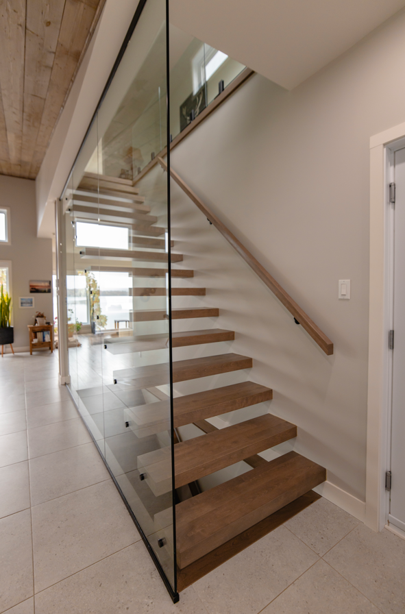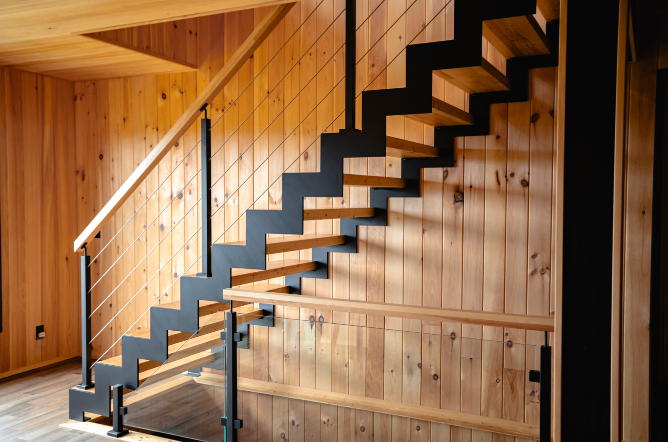 Escalier en Nordiklam, limon de métal en Z, garde corps en verres et cables -