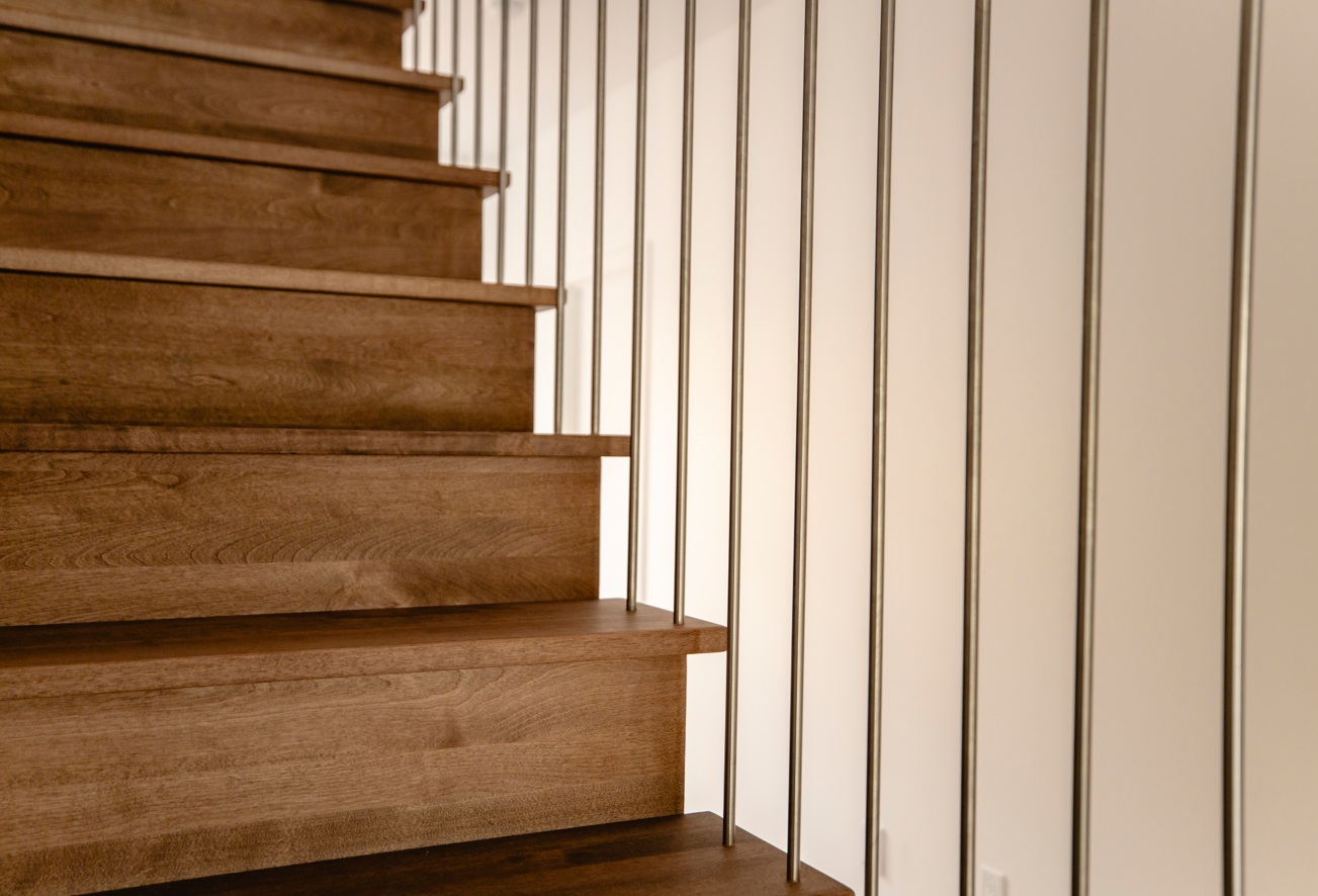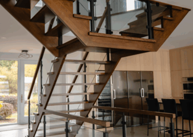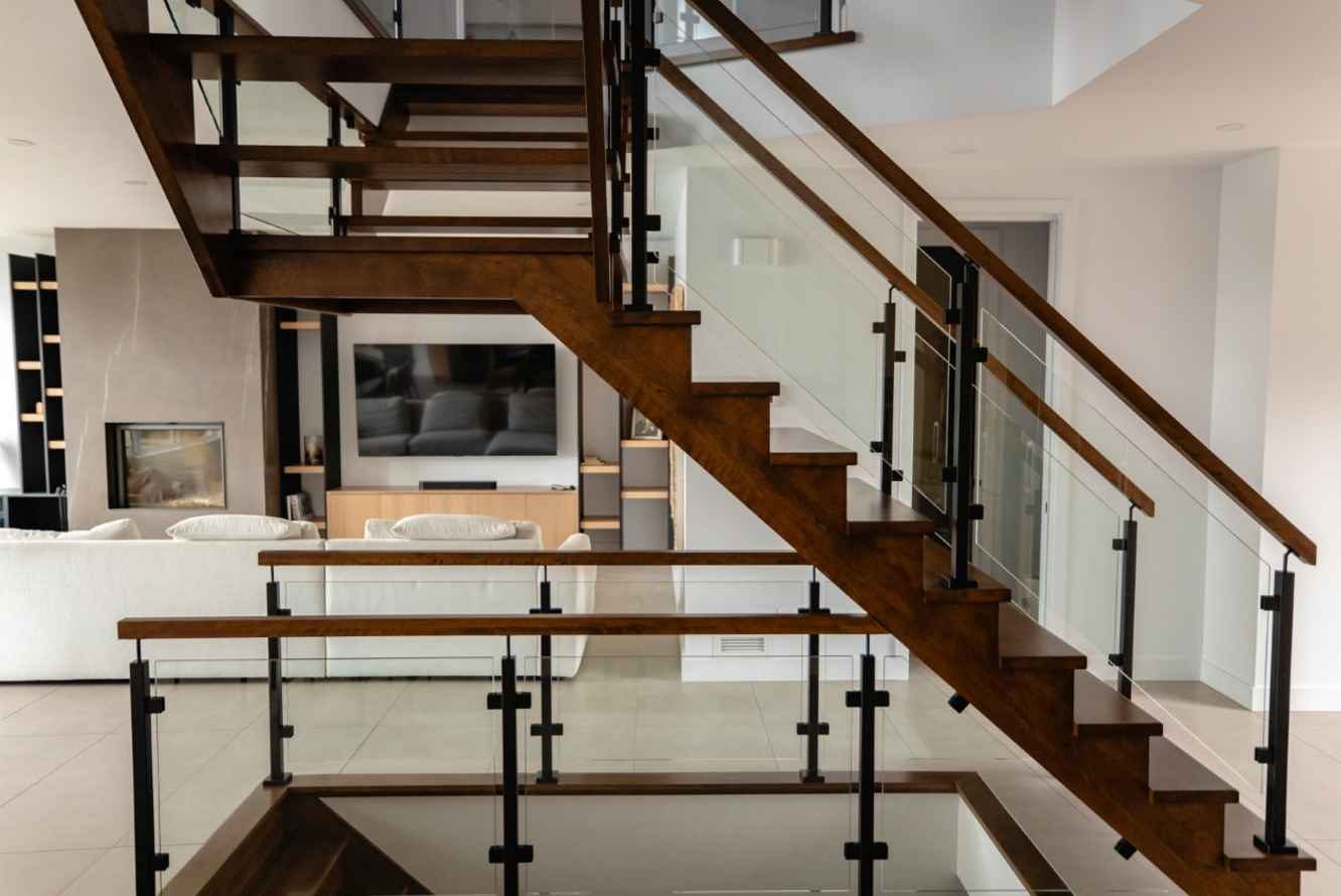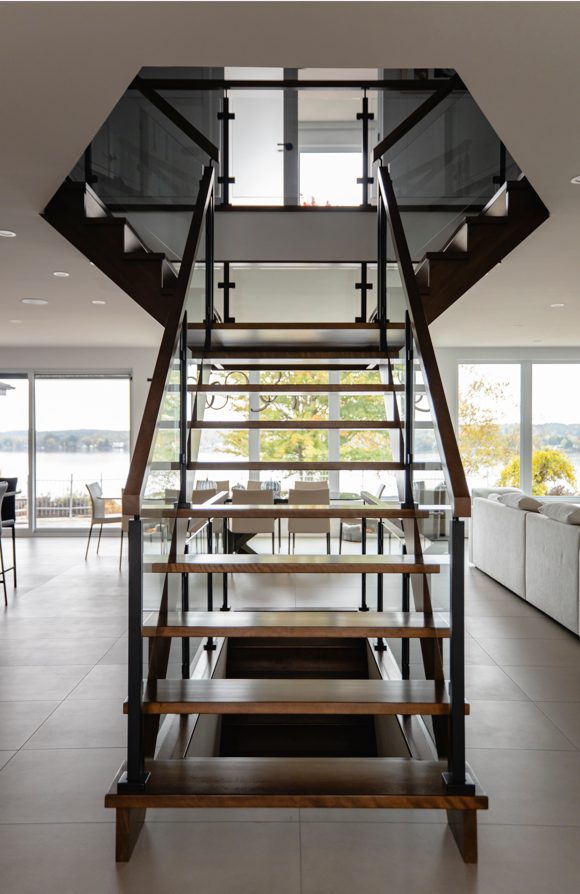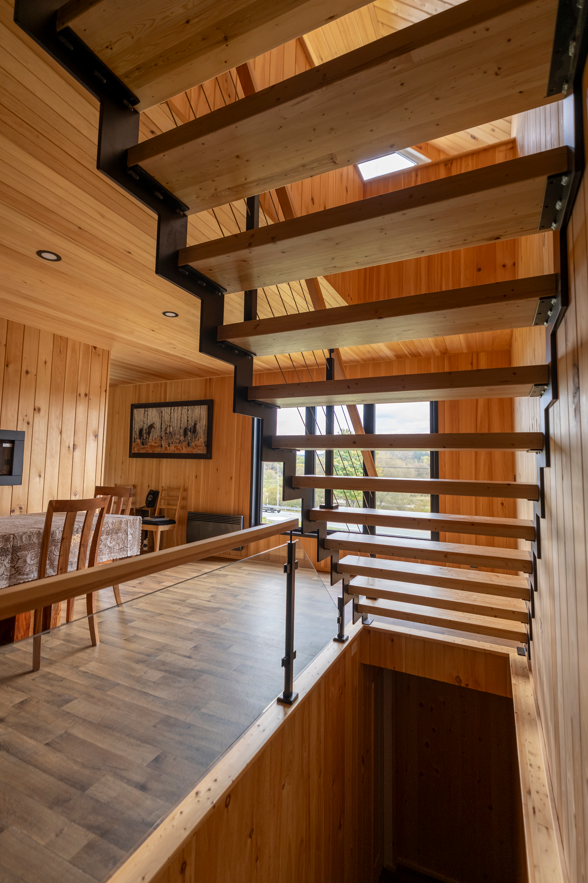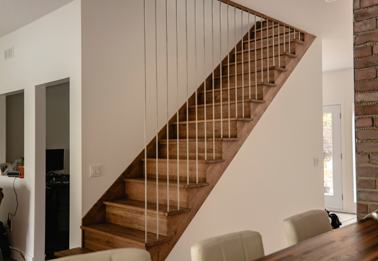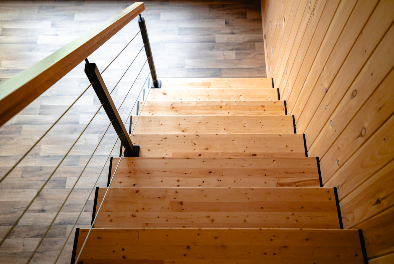 Escalier en Nordiklam, limon de métal en Z, garde corps en verres et cables -