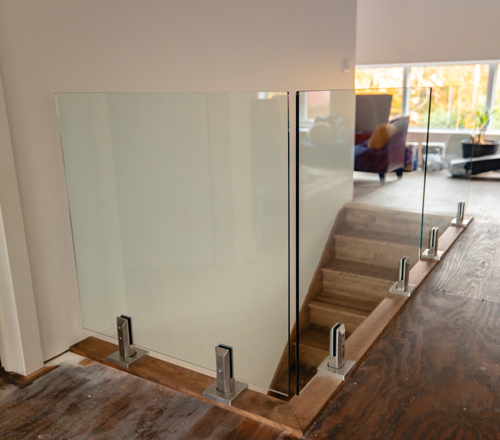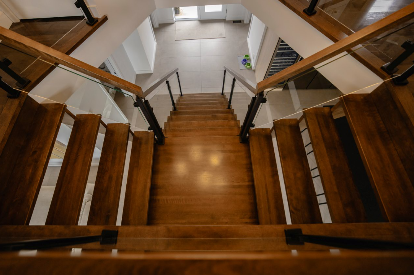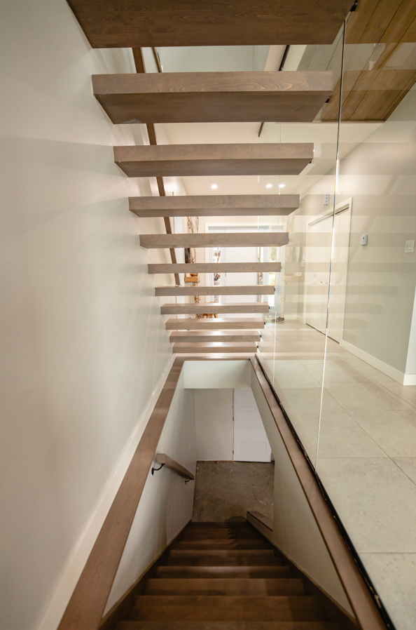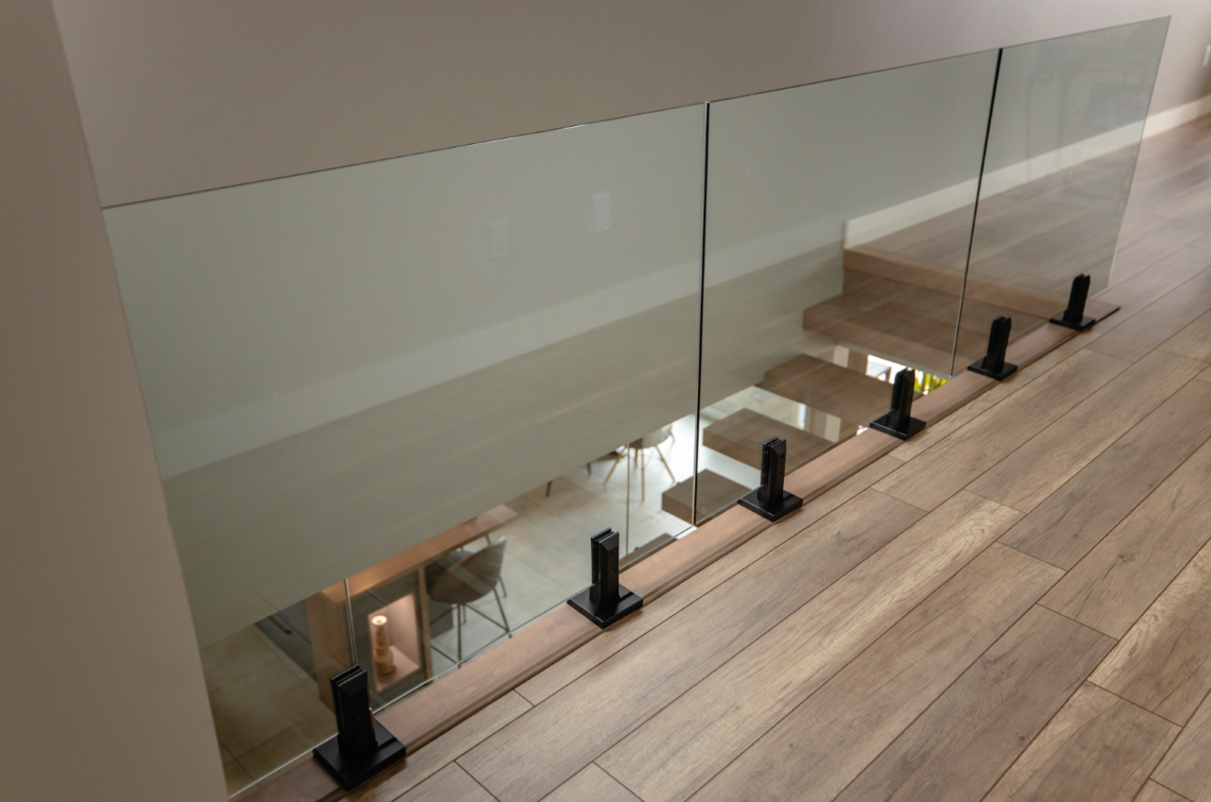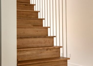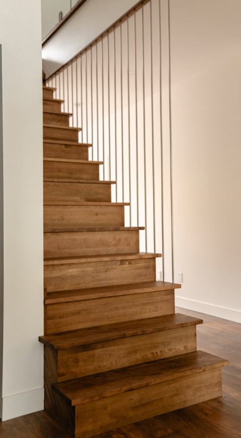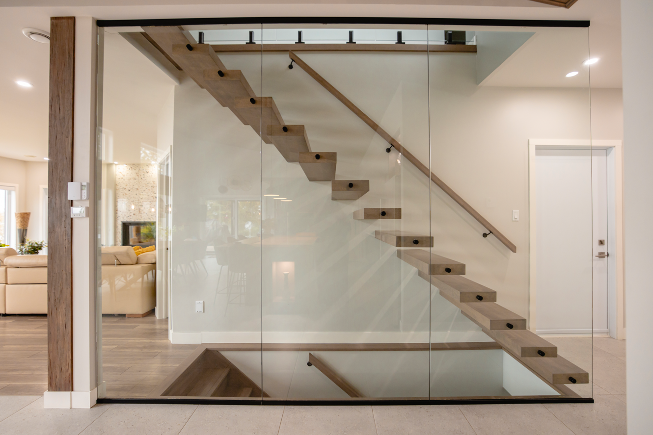 Escalier en Nordiklam, limon de métal en Z, garde corps en verres et cables -